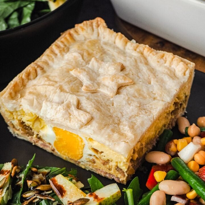 This easy bacon and egg pie with puff pastry is an easy make-ahead dish. With hidden whole eggs inside, it's perfect for Easter brunch.