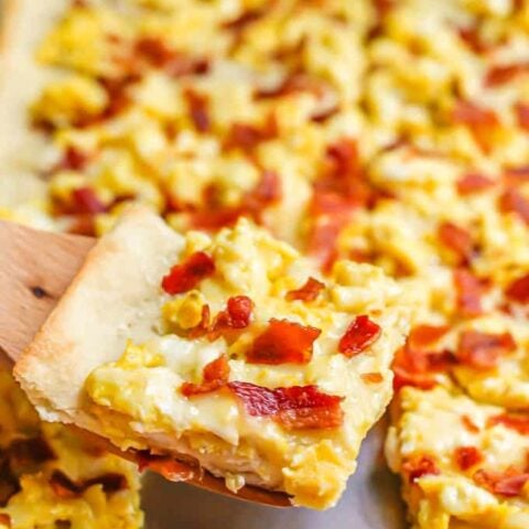 Breakfast pizza has fluffy, scrambled eggs, cooked, crumbled bacon and plenty of cheese for a warm, melty and seriously fun breakfast!