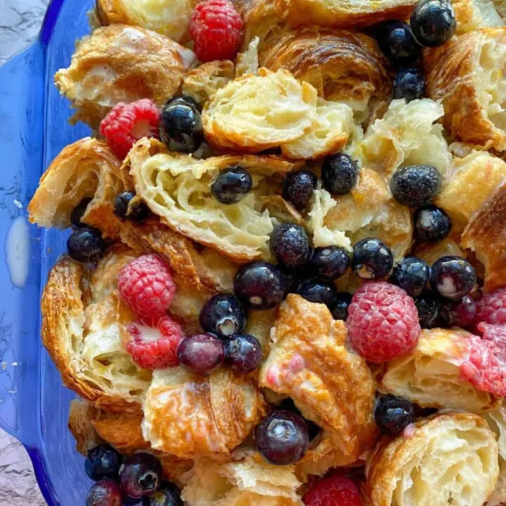 Croissant Bread Pudding is a yummy combination of buttery croissants, fresh fruit and a sumptuous vanilla custard pudding that's both rich and luxurious. But perhaps the best part of this bread pudding recipe is you can serve it warm or cold.