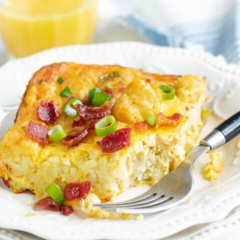 This Tater Tot Breakfast Casserole has super creamy eggs, bacon (or sausage), and 2 kinds of cheese! It’s easy to make ahead of time and is perfectly freezer-friendly!