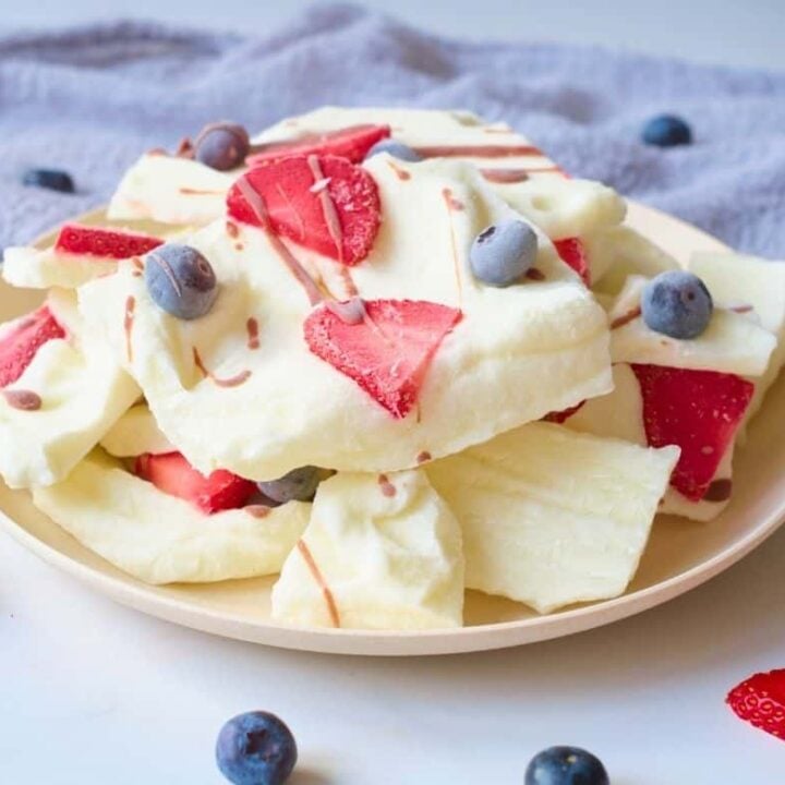 Berry frozen yogurt bark is super easy to make with no cooking required! Made with Greek yogurt, fresh berries, honey, and a chocolate drizzle, everyone (including kids) will love this!